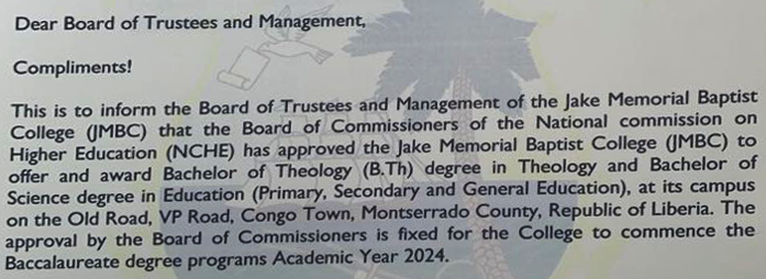 For over three years we have been actively working to upgrade the Jake Memorial Baptist College from having permission to offer Associate degrees to the level where we can grant Bachelor’s degrees. We felt a real urgency to push for this before the inauguration and subsequent change of government officials. By God’s grace, on Friday, January 19, three days before the January 22nd inauguration of Joseph Boakai as the new President of Liberia, we were given our permission! There has been great rejoicing by the administration, staff, present and former students, and also of future students!